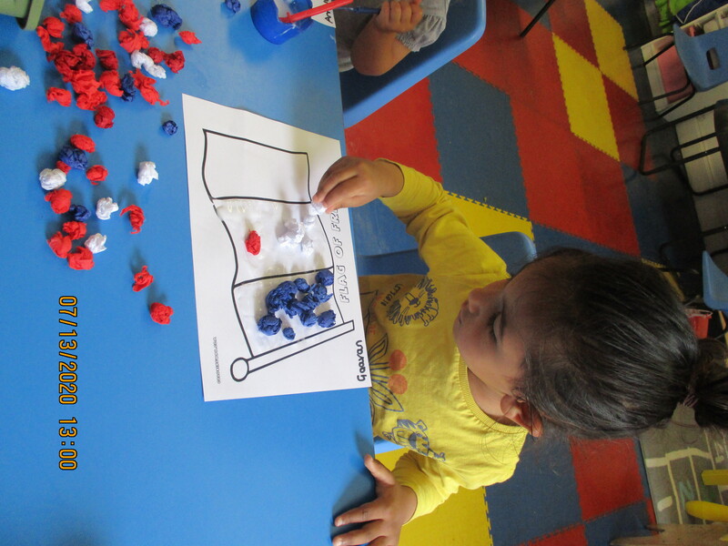 Activities - Sorting red,blue and white cubes on tray, Making Eiffel towel pictures, making flags and making cheese straws.